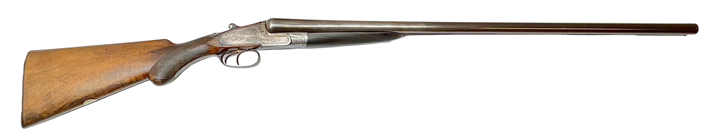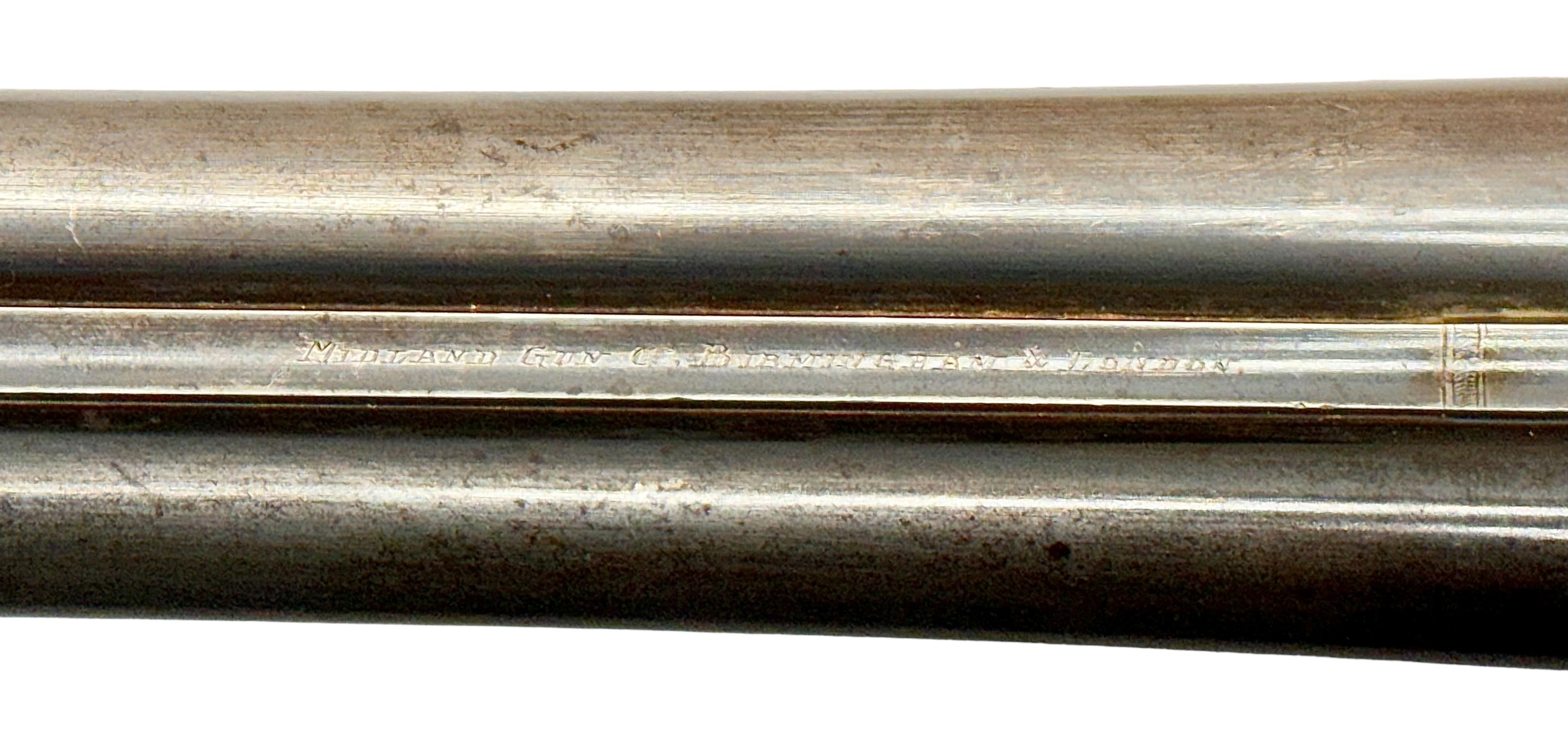 English made, 12 Gauge, side by side shotgun by Midland Arms Co, Birmingham and London and so marked. Carrying 30 inch barrels (Left IM, Right IC) , 14 inch length of pull, and overall length of 46 1/2 inches. Birds head lock on an engraved receiver, and trigger guard. Double triggers, Bright, shiny bores, tight action, straight screws.  Nicely grained Walnut stock and forearm. Anson release, Prince of Wales stock, Presentation disc, plastic buttplate. A very nice example of the gunmakers art, at a great value, that is sure to enhance any collection.