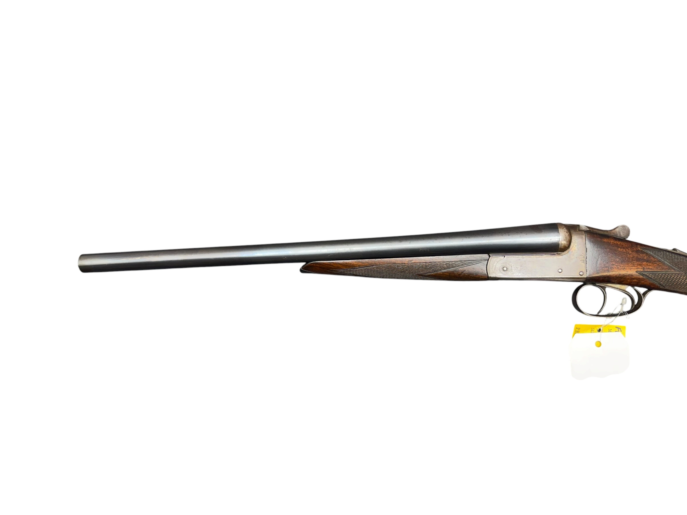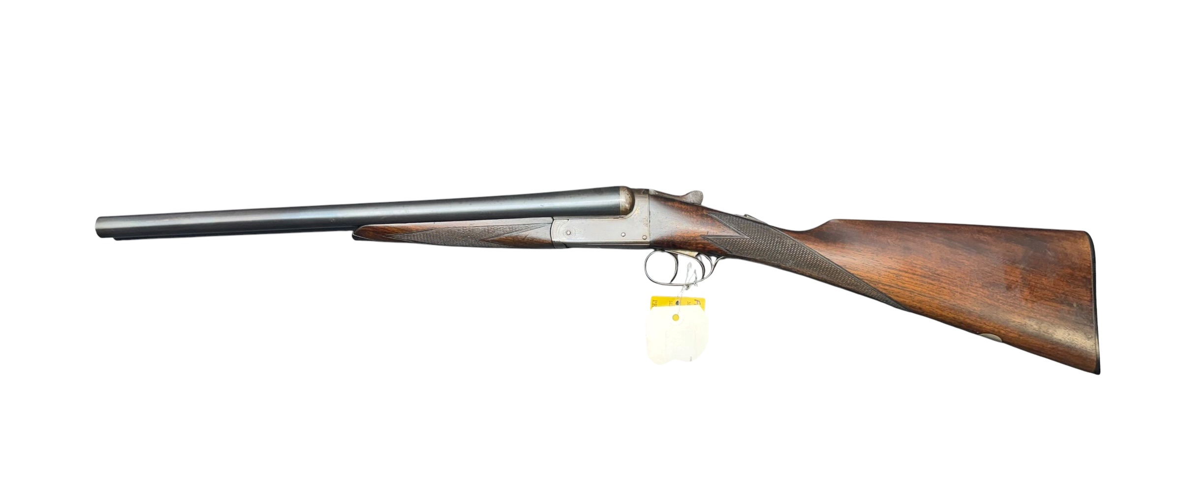 Side view of a long-barreled shotgun with a wooden stock and metal receiver, a tag hanging from the trigger guard on a white background.