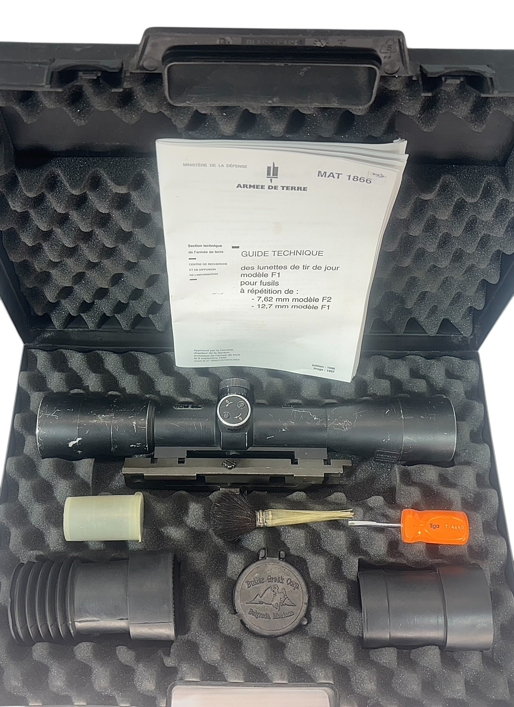 These are original French Military Scrome J8 scopes that were issued to French forces. Sourced directly from the French Ministry of Defense, these scopes have optics in very good condition and come in the original factory case, complete with rubber eyepiece, sun shade, front scope cover, adjustment screwdriver and cleaning brush. Also comes with original mount and green field carrying case with carry strap.