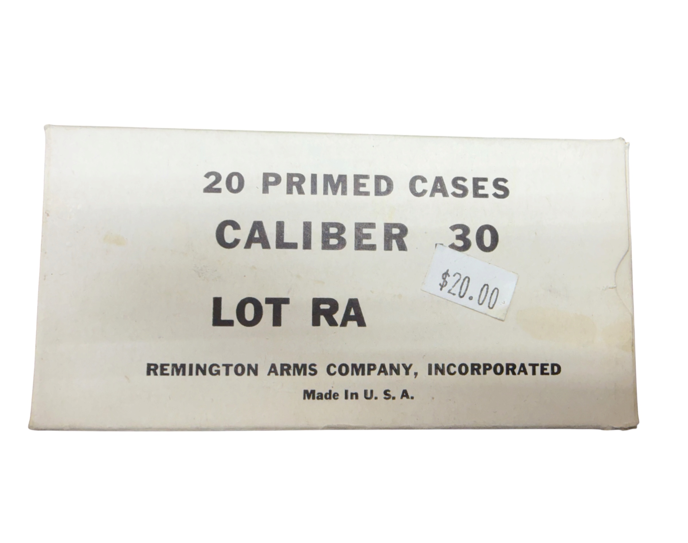 Original box of 20 primed .30 caliber cases from Remington Arms Company, marked Lot RA.