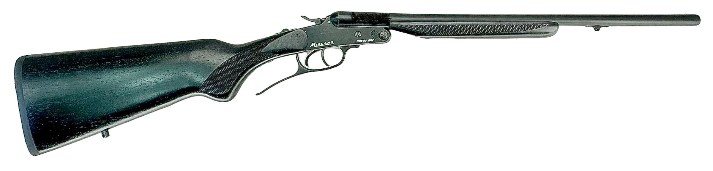 Midland Arms is now proud to offer its Backpack model of fold-over shotguns in a side by side! Like all Midland shotguns, the side by side features Mobilchokes for maximum versatility has double triggers and extractors making it legal for Cowboy Action shooting and features narrow-set external hammers as well. This model features a rugged synthetic stock with oil finish and a rubber buttpad for maximum comfort.